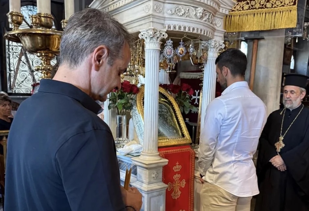 Λίγα λεπτά αργότερα, οι δεκάδες πιστοί που βρίσκονταν στην Παναγία είδαν ανάμεσά τους τον «Νόλε» και τον κ. Μητσοτάκη να περιμένουν να ανάψουν κερί και να προσκυνήσουν τη θαυματουργή εικόνα.