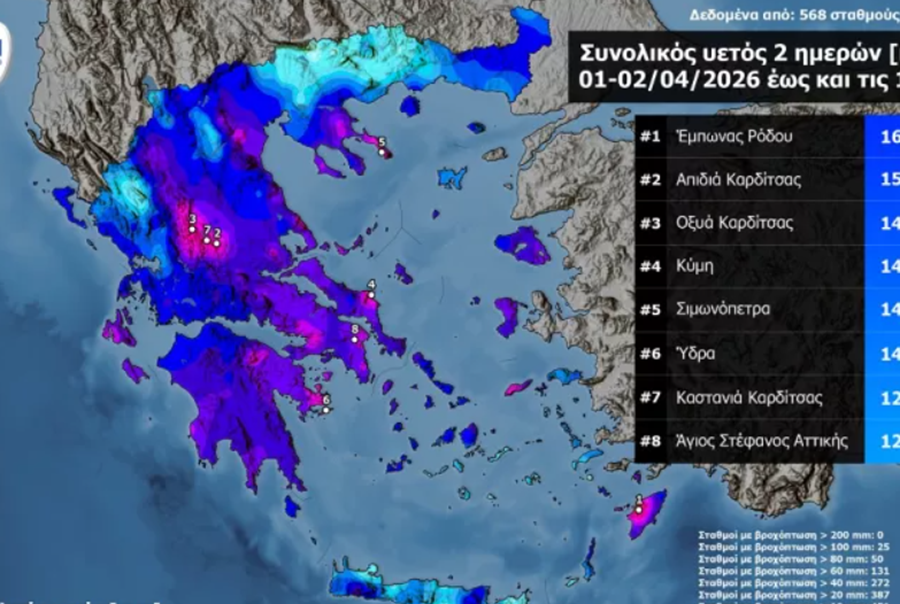 Ισχυρές βροχές και καταιγίδες σημειώθηκαν το διήμερο της Τετάρτης Απριλίου και της Πέμπτης Απριλίου έως και τις 10:00, στα περισσότερα τμήματα της χώρας, με τα μεγαλύτερα ύψη βροχής να καταγράφονται στην Πελοπόννησο, στην Ανατολική Στερεά και Εύβοια, στη Θεσσαλία, στη Χαλκιδική, στα Επτάνησα, στις Κυκλάδες, στη Ρόδο και σε νησιά του Κεντρικού και Ανατολικού Αιγαίου, όπως παρουσιάζεται στον χάρτη χωρικής κατανομής της βροχόπτωσης στο παρακάτω σχήμα.