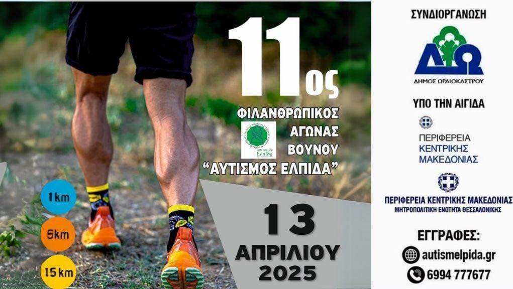 Ο 11ος Αγώνας Βουνού «Αυτισμός – ΕΛΠΙΔΑ», των 1 χλμ., 5+ χλμ. και 15 χλμ., θα διεξαχθεί στο περιαστικό δάσος του Δήμου Ωραιοκάστρου. Η διαδρομή των 15 χλμ. προσφέρει στους αθλητές/δρομείς πολλά οφέλη από την εναλλαγή υψομέτρου και την υψομετρική διαφορά των 500 μέτρων.