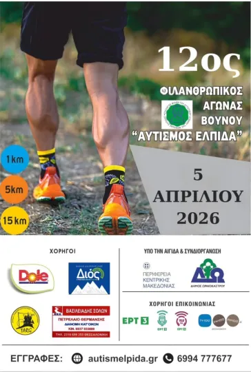 Ο 12ος Αγώνας Βουνού “Αυτισμός – ΕΛΠΙΔΑ”, των 1km, 5+km και 15km, θα διεξαχθεί στο περιαστικό δάσος του Δήμου Ωραιοκάστρου. Η διαδρομή των 15km προσφέρει στους αθλητές/δρομείς πολλά οφέλη από την εναλλαγή υψομέτρου και την υψομετρική διαφορά των 500 μέτρων. Σκοπός του αγώνα, πέρα από την ανάδειξη των ωφελειών της άθλησης, είναι κυρίως η ευαισθητοποίηση των πολιτών απέναντι στις ευάλωτες κοινωνικές ομάδες, όπως είναι τα παιδιά με αυτισμό, και η υποστήριξη της Μονάδας Αυτιστικού Ατόμου «ΕΛΠΙΔΑ».