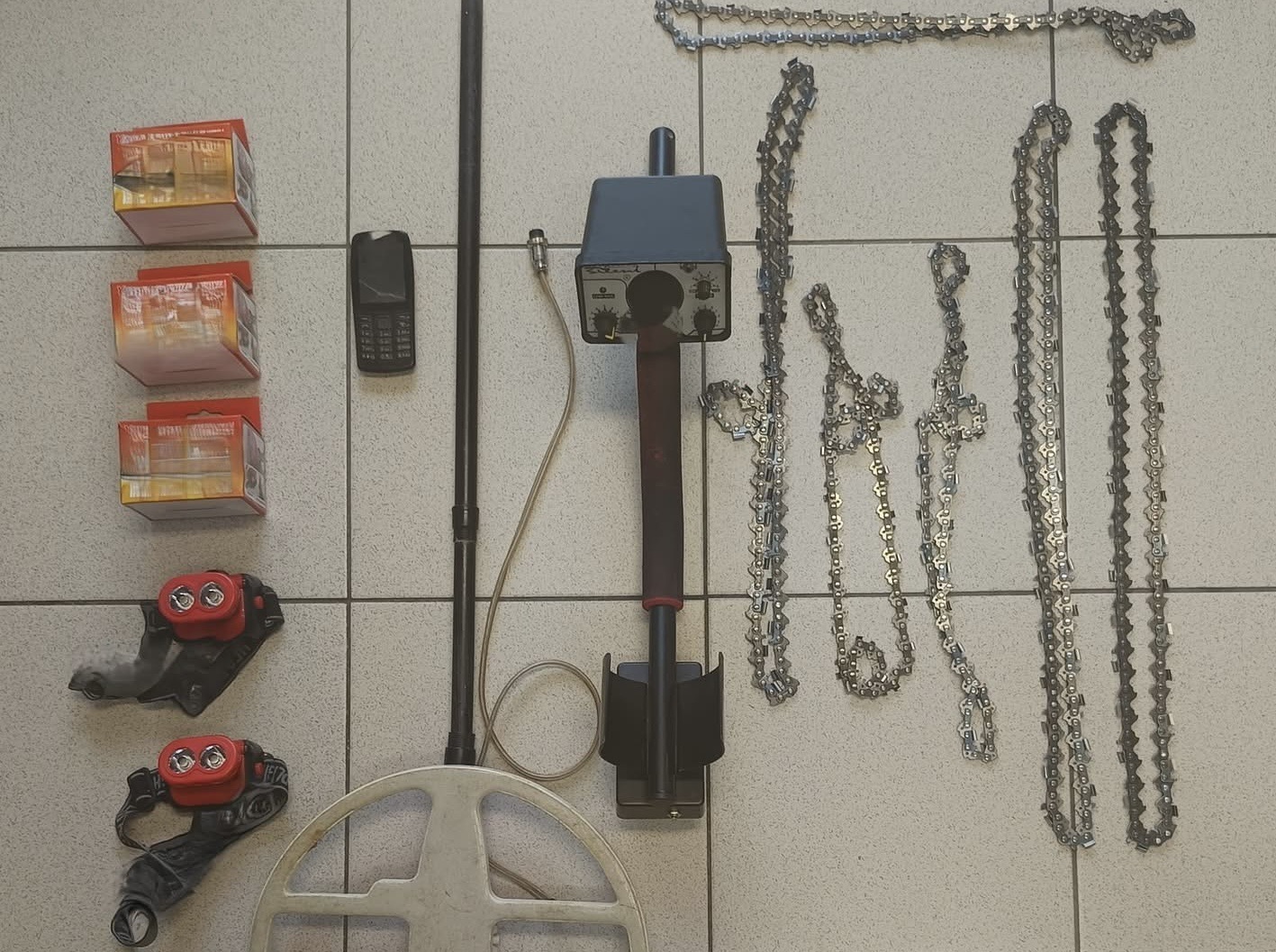 Κατά την έρευνα στο σπίτι του, οι αστυνομικοί κατέσχεσαν κινητό τηλέφωνο, έξι ανταλλακτικές αλυσίδες αλυσοπρίονου, πέντε φακούς κεφαλής για χρήση κατά τη διάρκεια της νύχτας και τον προαναφερόμενο ανιχνευτή μετάλλων.