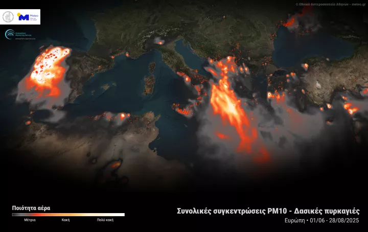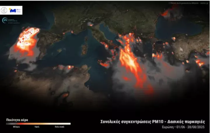 Η ποιότητα του αέρα σε περιοχές της Μεσογείου ήταν ιδιαίτερα επιβαρυμένη το καλοκαίρι του 2025, λόγω των εκτεταμένων δασικών πυρκαγιών, σύμφωνα με ανάλυση της μονάδας METEO του Εθνικού Αστεροσκοπείου Αθηνών.