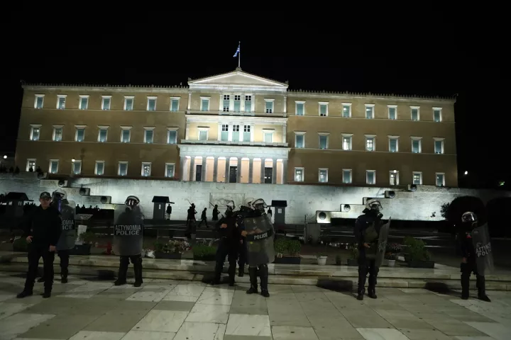 Αστυνομικές δυνάμεις παρατάχθησαν μπροστά από την πλατεία, καθώς συλλογικότητες της αριστεράς και ομάδες αντιεξουσιαστών πραγματοποιούσαν πορεία μπροστά από το σημείο.