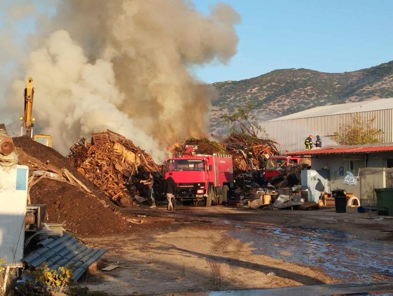 Η φωτιά είναι πλέον οριοθετημένη και περιορισμένη στον αύλειο χώρο του εργοστασίου, σε μια έκταση τριών στρεμμάτων.