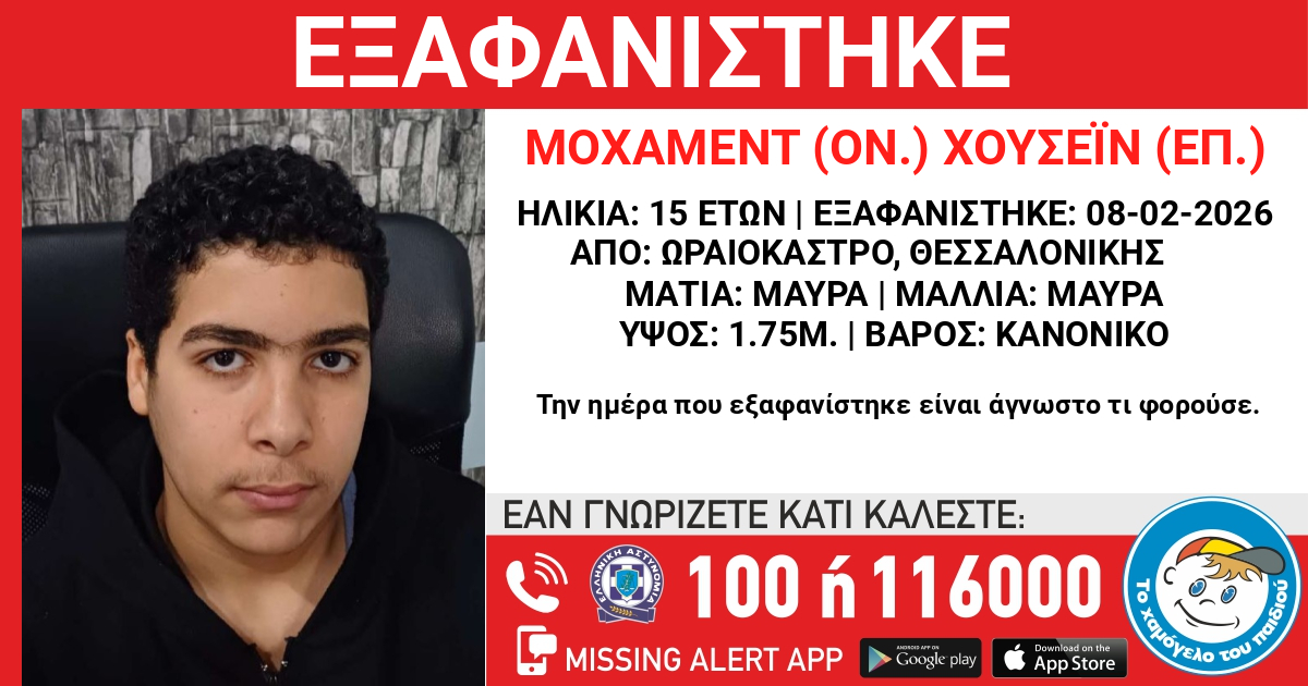 Πρόκειται για τον Μοχάμεντ (ον) Χουσεΐν (επ), αιγυπτιακής καταγωγής, τα ίχνη του οποίου χάθηκαν χθες. Το Χαμόγελο του Παιδιού ενημερώθηκε σήμερα 09/02/2026 και προχώρησε άμεσα σε δημοσιοποίηση των στοιχείων, κατόπιν εισαγγελικής εντολής, καθώς ενδέχεται να συντρέχουν λόγοι οι οποίοι θέτουν την ζωή του σε κίνδυνο.