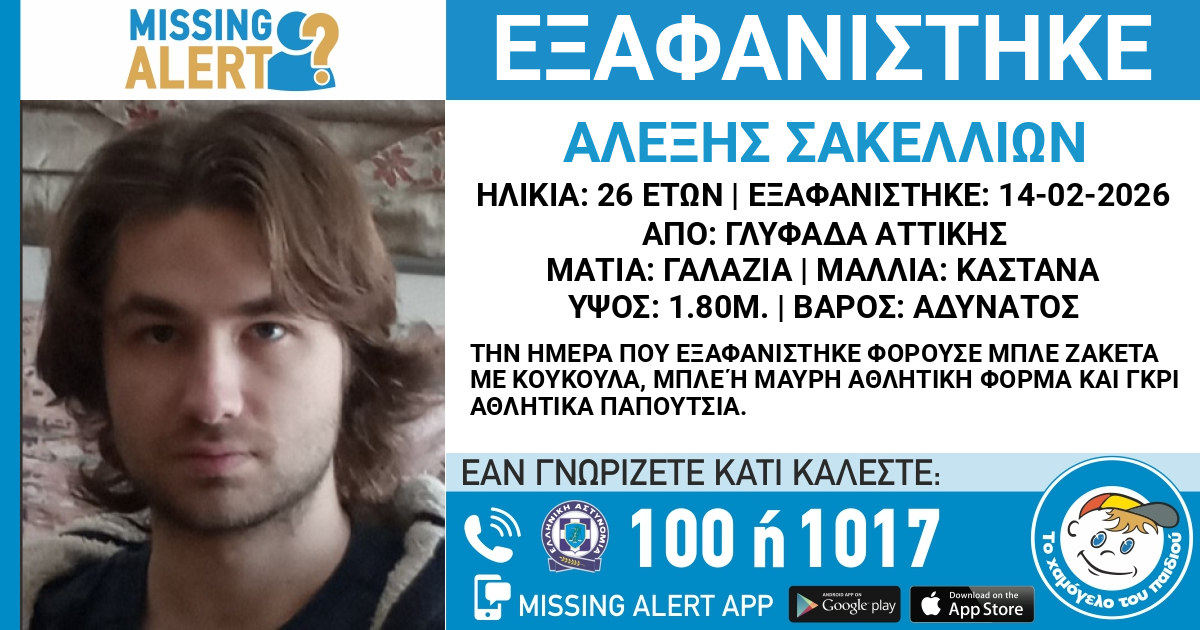 «Το Χαμόγελο του Παιδιού» ενημερώθηκε σήμερα, 18/02/2026, για την εξαφάνιση του Αλέξη Σακελλίων και προχώρησε στη δημοσιοποίηση των στοιχείων του ενήλικα κατόπιν αιτήματος της οικογένειας του, καθώς ενδέχεται να συντρέχουν λόγοι οι οποίοι θέτουν τη ζωή του σε κίνδυνο.