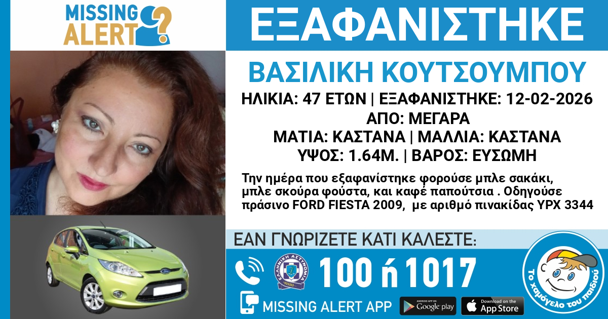 Το «Χαμόγελο του Παιδιού» ενημερώθηκε χθες, 16/02/2026, για την εξαφάνιση της Βασιλικής Κουτσούμπου και προχώρησε άμεσα στη δημοσιοποίηση των στοιχείων της ενήλικης, κατόπιν αιτήματος της οικογένειας της, καθώς ενδέχεται να συντρέχουν λόγοι, οι οποίοι θέτουν τη ζωή της σε κίνδυνο.