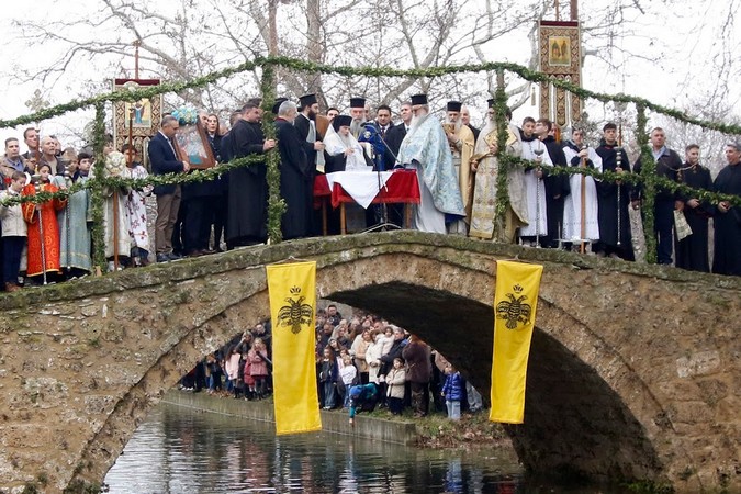 Στη συνέχεια, κλήρος και λαός από όλες τις ενορίες της πόλεως κατευθύνθηκαν στην περιοχή Κιουπρί και την ιστορική βυζαντινή γέφυρα, όπου ο Σεβασμιώτατος τέλεσε τον καθαγιασμό των υδάτων παρουσία των εκπροσώπων των τοπικών αρχών και πλήθους πιστών. Μάλιστα οι τολμηροί οι οποίοι έπεσαν στο νερό για τον Τίμιο Σταυρό έλαβαν μικρούς αναμνηστικούς σταυρούς ως ευλογία από τον Σεβασμιώτατο.