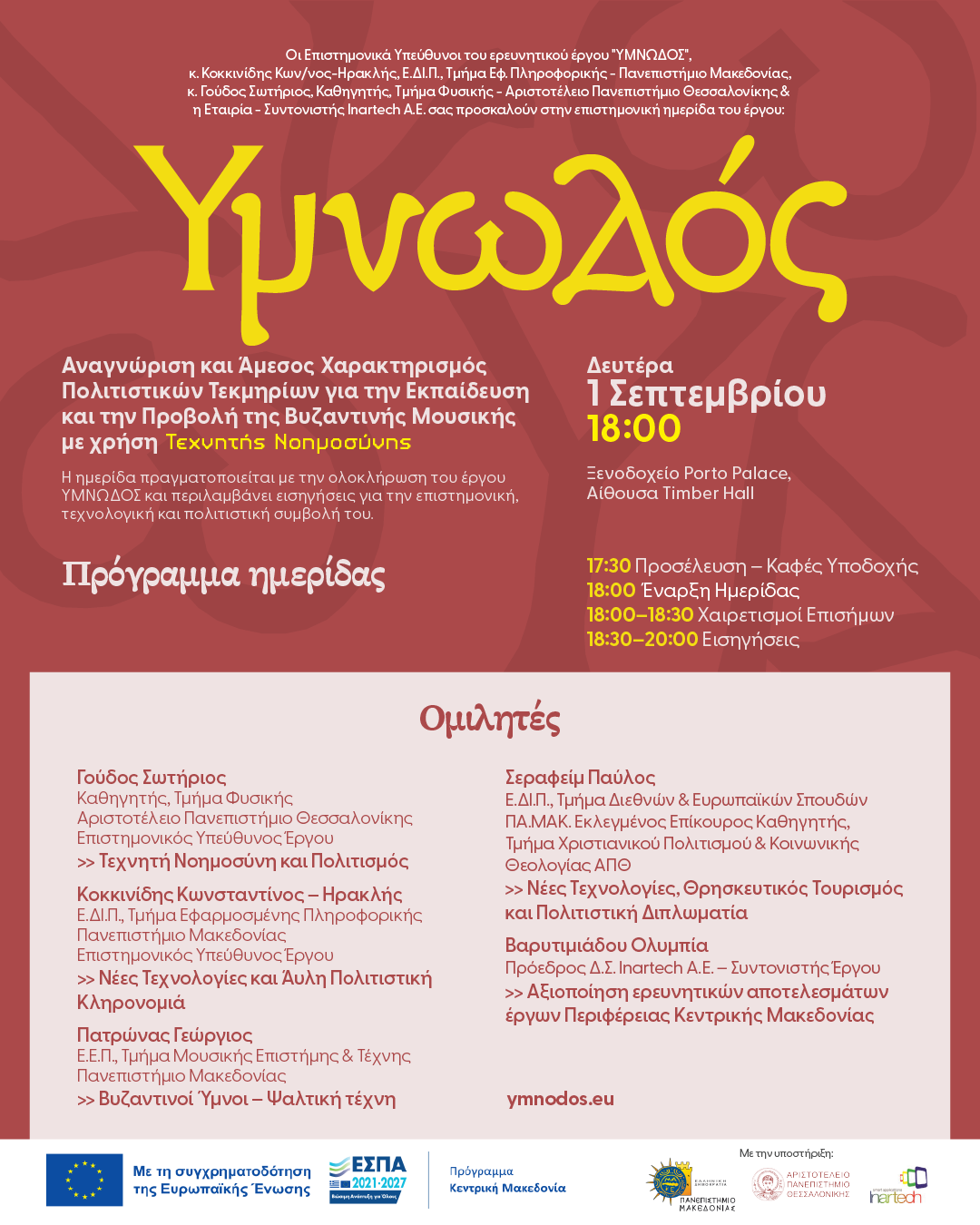 Το έργο ΥΜΝΩΔΟΣ (‘’Αναγνώριση και Άμεσος Χαρακτηρισμός Πολιτιστικών Τεκμηρίων για την Εκπαίδευση και την Προβολή της Βυζαντινής Μουσικής με Χρήση Τεχνητής Νοημοσύνης’’) συνδυάζει τις ανθρωπιστικές σπουδές με τις πιο σύγχρονες τεχνολογίες, δημιουργώντας ένα πρωτοποριακό σύστημα που «ακούει» τους βυζαντινούς ύμνους και τους αναγνωρίζει αυτόματα, προσφέροντας τεκμηριωμένη πληροφόρηση στον χρήστη – μέσω κινητής συσκευής.