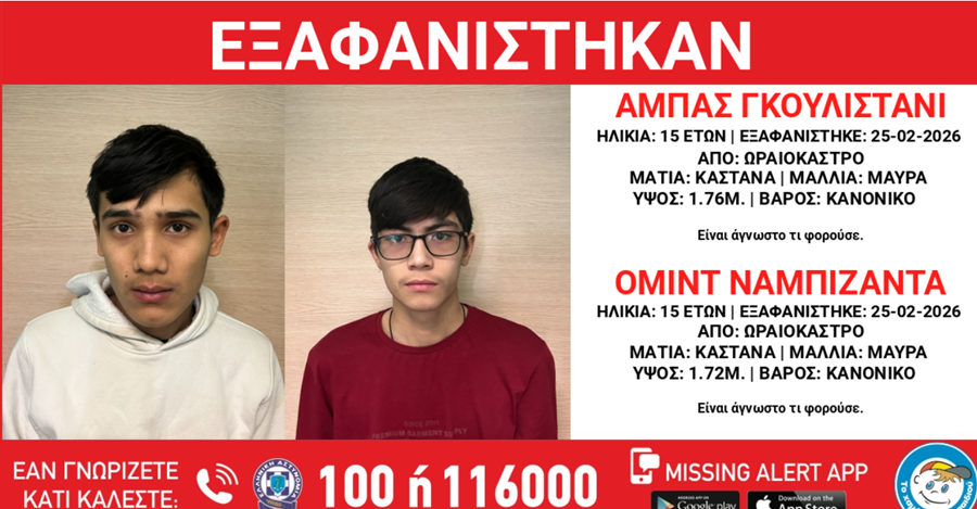 Εξαφανίστηκαν χθες, Τετάρτη, 25 Φεβρουαρίου, από χώρο φιλοξενίας ασυνόδευτων ανηλίκων στο Ωραιόκαστρο Θεσσαλονίκης ο Abbas Gulistani και ο Omid Nabizada 15 ετών, αφγανικής καταγωγής.