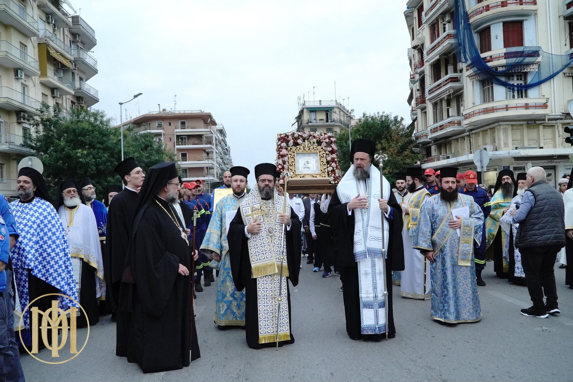 Το ιερό και χαριτοφόρο σέβασμα της Παναγίας μετέφερε στην Θεσσαλονίκη, επικεφαλής του ιερού Κλήρου και του ευσεβούς λαού της Κομοτηνής, ο Σεβασμιώτατος Μητροπολίτης Μαρωνείας και Κομοτηνής κ. Παντελεήμων και υποδέχθηκε ο Παναγιώτατος Μητροπολίτης Θεσσαλονίκης κ. Φιλόθεος, ο ιερός Κλήρος, οι Άρχοντες και οι ευσεβείς Χριστιανοί της Θεσσαλονίκης.