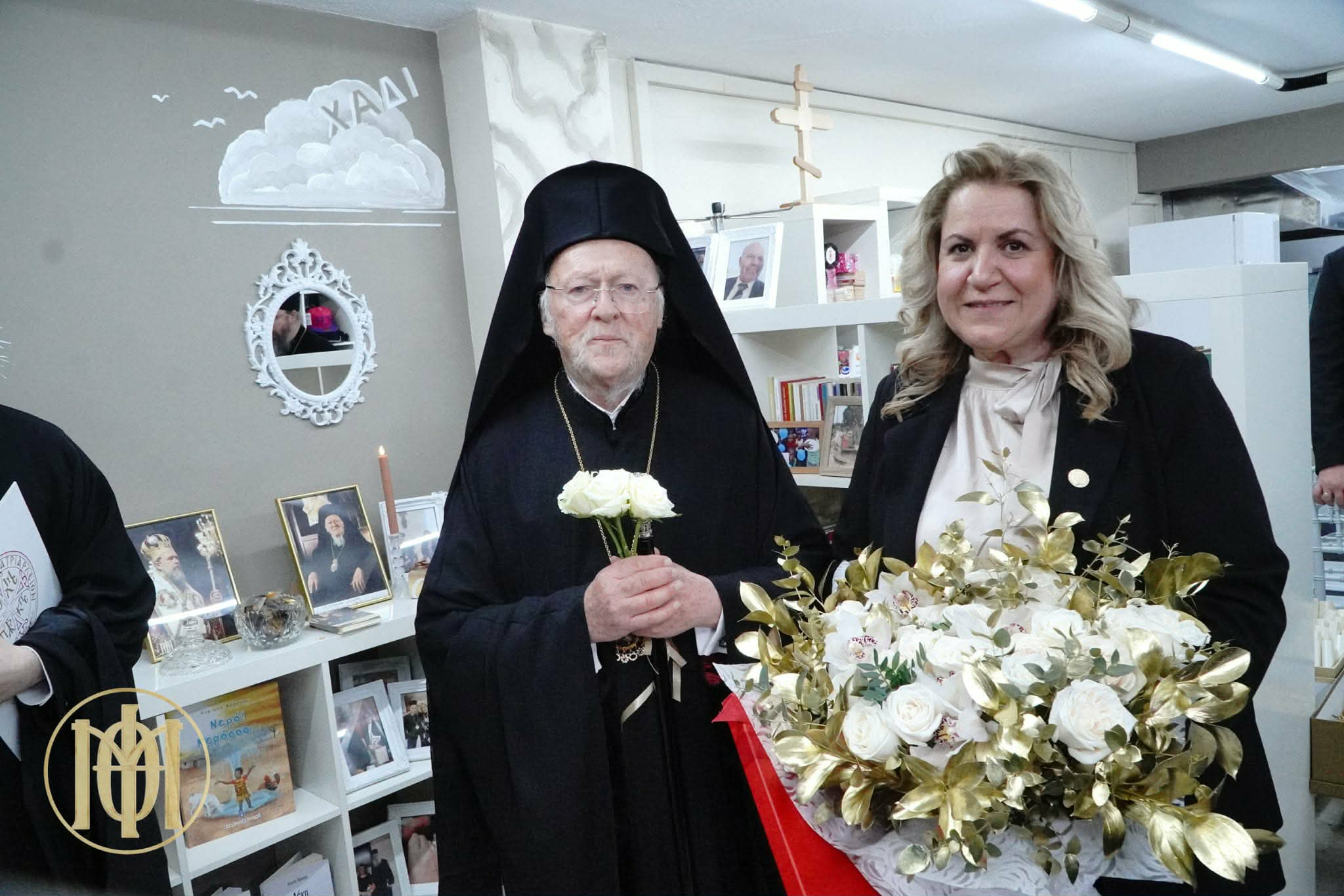 Από την πλευρά της, η κ. Φράγκου χάρισε στον Παναγιώτατο ένα χρυσό στεφάνι ελιάς με χρυσή πλάκα, πάνω στην οποία χαράχτηκε ένα μικρό απόσπασμα από το 4ο βιβλίο της, αφιερωμένο στα 34 χρόνια της Πατριαρχικής του πορείας.