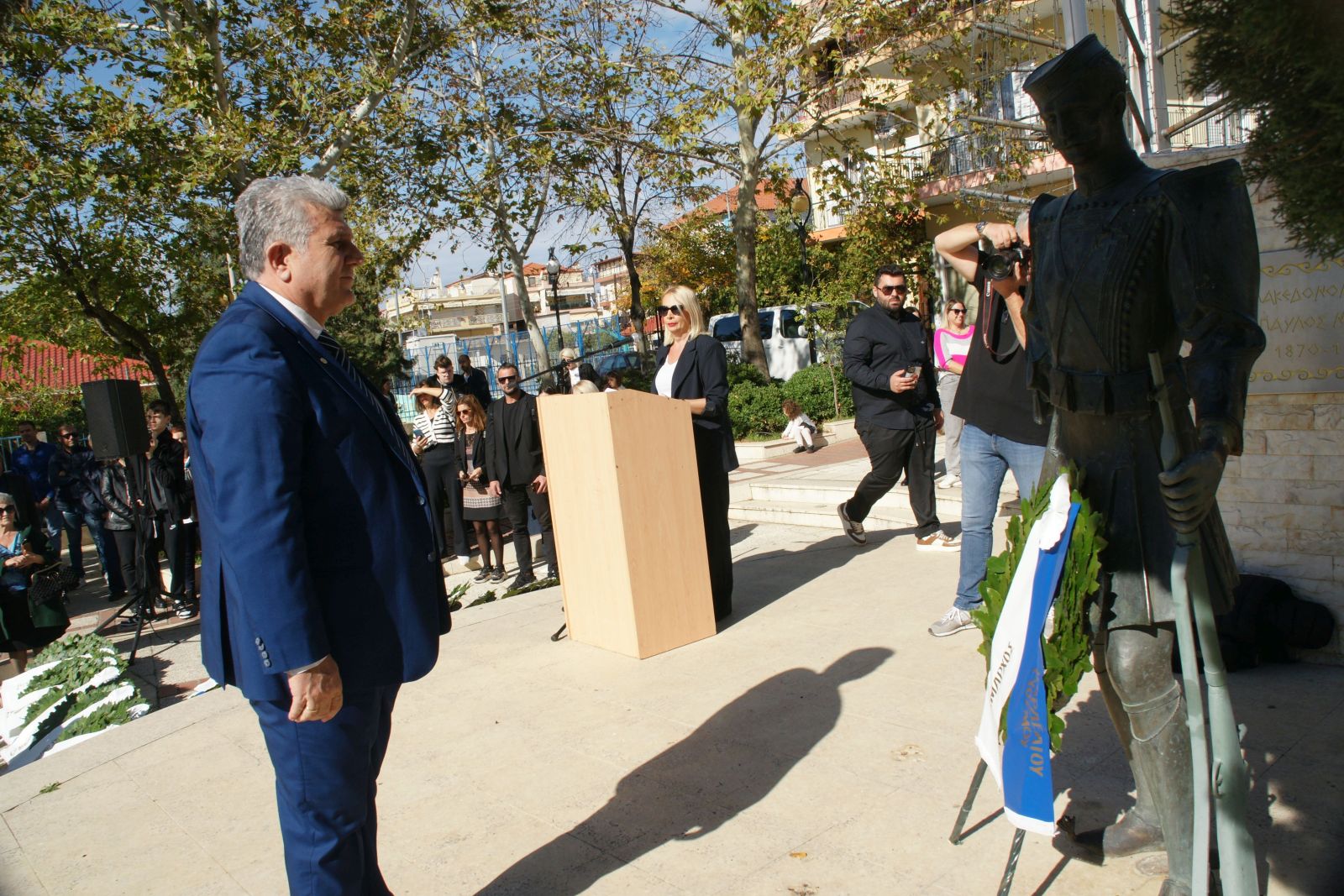 Στεφάνια κατέθεσαν ο δήμαρχος Κορδελιού - Ευόσμου, Λευτέρης Αλεξανδρίδης, ο Αστέριος Κομματάς, περιφερειακός σύμβουλος Κεντρικής Μακεδονίας ως εκπρόσωπος της περιφερειάρχη, Αθηνάς Αηδονά, ο βουλευτής Α' Θεσσαλονίκης της Ελληνικής Λύσης, Συμεών Κουπελόγλου, η αντιδήμαρχος Παιδείας Κορδελιού - Ευόσμου, Σύμινα Καλού, ο εκπρόσωπος της Ένωσης Στρατιωτικών Περιφέρειας Κεντρικής Μακεδονίας, Ανδρέας Κεχαγιάς, ο εκπρόσωπος του Πυροσβεστικού Σώματος, Κωνσταντίνος Θεοδοσίου, η πρόεδρος της Κοινότητας Ελευθερίου - Κορδελιού, Έφη Καπνοπούλου, εκπρόσωποι των τοπικών οργανώσεων της Νέας Δημοκρατίας, του ΠΑΣΟΚ - Κίνημα Αλλαγής, και του ΣΥΡΙΖΑ - Προοδευτική Συμμαχία, μαθητές και εκπρόσωποι της Ένωσης Γονέων, πολιτιστικών και αθλητικών συλλόγων. Ακολούθησε ενός λεπτού σιγή και ο Εθνικός Ύμνος.