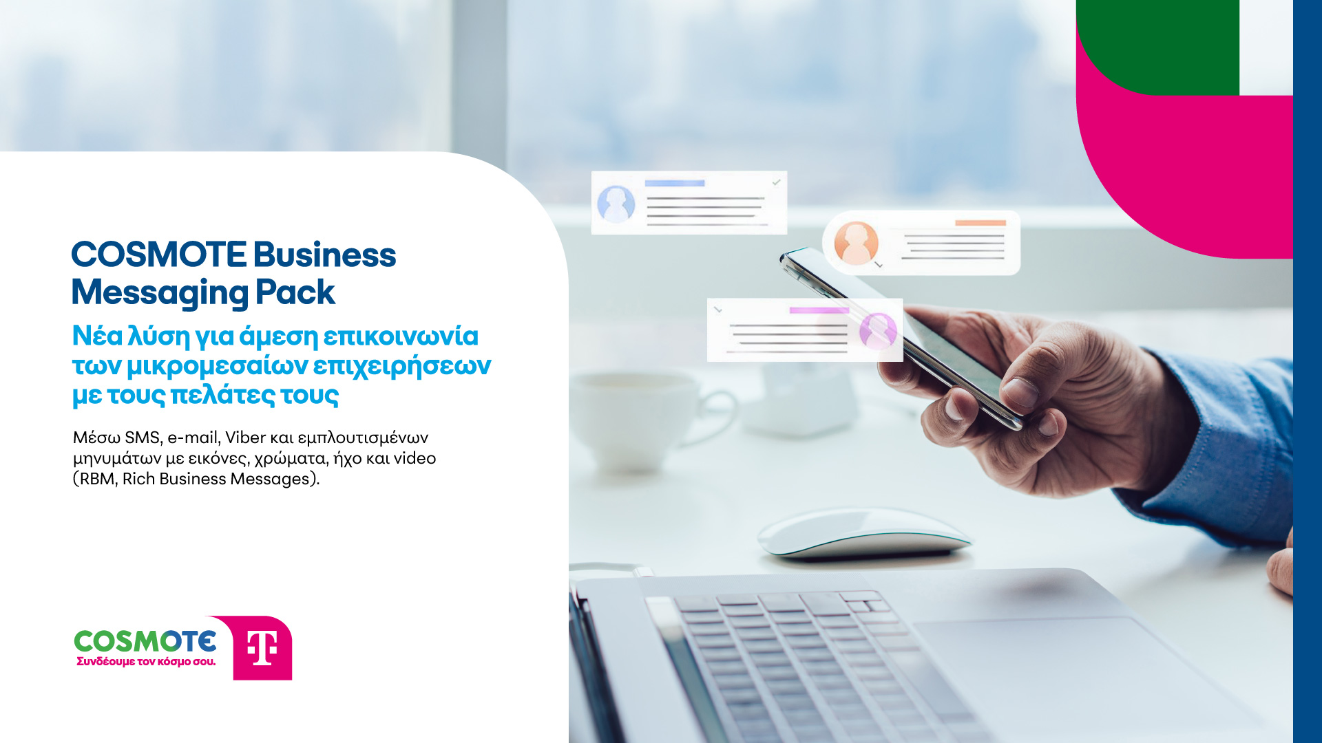 Με το COSMOTE Business Messaging Pack, οι επιχειρήσεις μπορούν να αλληλοεπιδρούν με τους πελάτες τους μέσα από μία ενιαία «έξυπνη» πλατφόρμα στο Cloud, επιλέγοντας τον τρόπο επικοινωνίας που τους ταιριάζει, για εύκολη και αυτοματοποιημένη αποστολή SMS, e-mail, εμπλουτισμένων μηνυμάτων RBM (Rich Business Messages) και Viber.