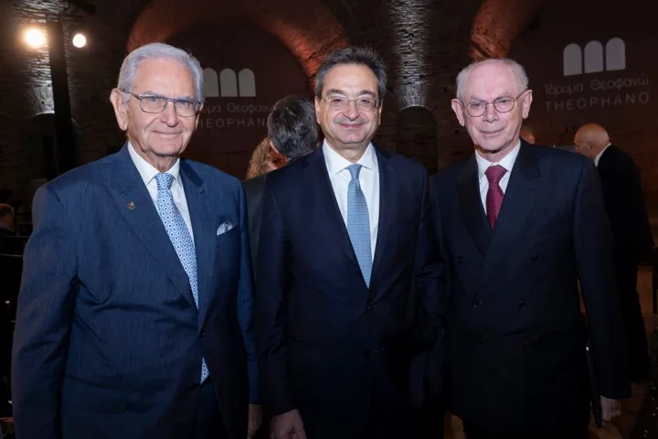 Από αριστερά προς τα δεξιά: Νικόλαος Ευθυμιάδης, Μέλος Διοικούσας Επιτροπής Ιδρύματος Θεοφανώ, Πρόεδρος του Ομίλου Αγροτεχνολογίας ΕΥΘΥΜΙΑΔΗ (Επι Τιμή) ε.Τ Πρόεδρος Συνδέσμου Βιομηχανιών Ελλάδος (Ελλάδα), Φωκίων Καραβίας, Διευθύνων Σύμβουλος της Eurobank Herman Van Rompuy, Πρόεδρος Συμβουλευτικής Επιτροπής Ιδρύματος Θεοφανώ, Επίτιμος Πρόεδρος του Ευρωπαϊκού Συμβουλίου, π. Πρωθυπουργός του Βελγίου