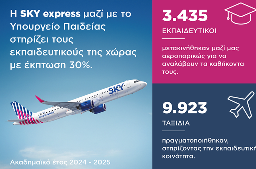 Το ακαδημαϊκό έτος 2024-2025, περισσότεροι από 3400 εκπαιδευτικοί ταξίδεψαν με τη SKY express σε κάθε γωνιά της Ελλάδας προς τον τόπο τοποθέτησής τους, πραγματοποιώντας συνολικά περίπου 10.000 ταξίδια. Η εκπαίδευση αποτελεί διαχρονική προτεραιότητα για τη SKY express, η οποία αγκαλιάζει και φέτος τη συγκεκριμένη πρωτοβουλία, επιβεβαιώνοντας τη δέσμευσή της να στέκεται αρωγός στους εκπαιδευτικούς της χώρας και να στηρίζει ουσιαστικά τις ανάγκες της ελληνικής κοινωνίας.