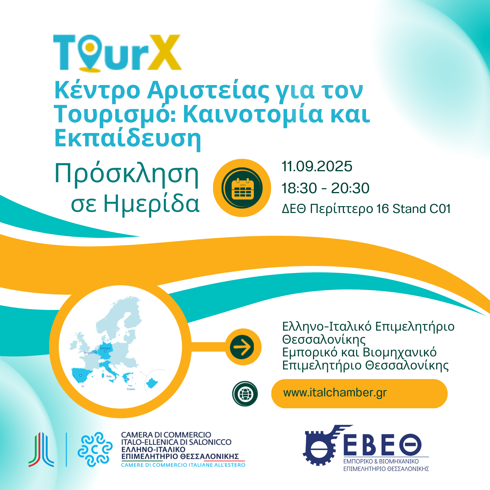 Στο πλαίσιο αυτό, και σε συνεργασία με το Εμπορικό και Βιομηχανικό Επιμελητήριο Θεσσαλονίκης (ΕΒΕΘ), διοργανώνει ημερίδα με θέμα: «TourX – Κέντρο Αριστείας για τον Τουρισμό: Καινοτομία και Εκπαίδευση», η οποία θα πραγματοποιηθεί την Πέμπτη 11 Σεπτεμβρίου 2025, ώρα 18:30 – 20:30, στο Περίπτερο 16, Stand C01 της ΔΕΘ.