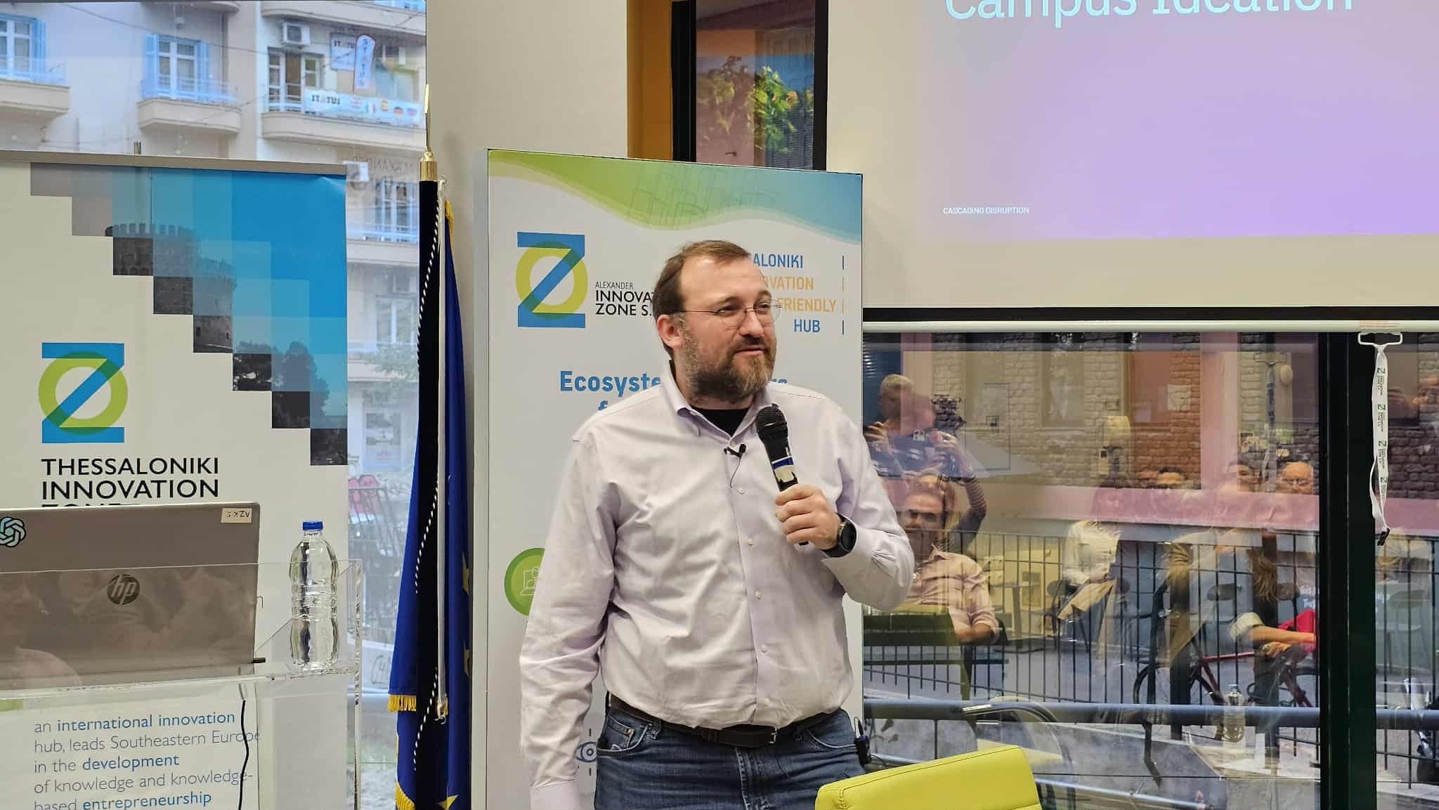 Μιλώντας στην Αλεξάνδρεια Ζώνη Καινοτομίας, ο κ. Hoskinson παρουσίασε το όραμά του για μια νέα γενιά επιχειρηματικών οικοσυστημάτων, όπου η τεχνητή νοημοσύνη, το blockchain και η συλλογική καινοτομία θα συνδυάζονται σε έναν φυσικό χώρο δημιουργίας και μάθησης.