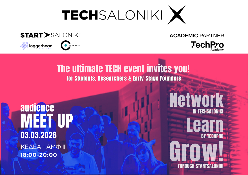 Mε αφορμή τις νέες δράσεις και πρωτοβουλίες που σχεδιάζει, το TechSaloniki X προσκαλεί νέους επιστημο-νες, προπτυχιακούς και μεταπτυχιακούς φοιτητές, ερευνητές και early-stage startuppers στο πρώτο Audi-ence Meet Up που διοργανώνει, την Τρίτη, 3 Μαρτίου 2026, 18:00-20:00 στο ΚΕΔΕΑ ΑΜΦΙΘΕΑΤΡΟ ΙΙ, 3ης Σεπτεμβρίου, Πανεπιστημιούπολη.