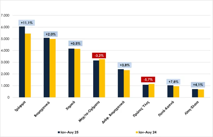 Σε κλαδικό επίπεδο, ο κλάδος των τροφίμων κατέγραψε τη μεγαλύτερη αύξηση σε απόλυτες τιμές, σημειώνοντας άνοδο €605,3 εκατ. ή 11,1%, επιβεβαιώνοντας τη συνεχιζόμενη δυναμική του στις διεθνείς αγορές. Αύξηση παρουσίασαν επίσης τα διάφορα βιομηχανικά είδη, με ενίσχυση €88,8 εκατ. (3,8%), καθώς και ο κλάδος των χημικών προϊόντων, που σημείωσε οριακή άνοδο €20,6 εκατ. ή 0,5%. Αξιοσημείωτη ήταν και η αύξηση στον κλάδο των ποτών–καπνών, ο οποίος ενισχύθηκε κατά €74,9 εκατ. ή 7,8%, καθώς και στα λίπη–έλαια, που κατέγραψαν άνοδο €27,8 εκατ. ή 4,1%. Θετική ήταν και η συμβολή των μη ταξινομημένων προϊόντων, τα οποία αυξήθηκαν κατά €17,6 εκατ. ή 22,5%. Αντιθέτως, ο κλάδος των πετρελαιοειδών παρουσίασε τη μεγαλύτερη μείωση τόσο σε απόλυτες όσο και σε ποσοστιαίους όρους, σημειώνοντας πτώση €2.688,3 εκατ. ή 25,1%, γεγονός που επηρέασε καθοριστικά τη συνολική εικόνα των εξαγωγών. Πτωτικά κινήθηκαν επίσης τα μηχανήματα–οχήματα (€-105,0 εκατ., -3,2%) και οι πρώτες ύλες (€-65,8 εκατ., -5,7%). Τέλος, τα βιομηχανικά προϊόντα συνέχισαν την ανοδική τους πορεία, ενισχυμένα κατά €101,3 εκατ. ή 2,0%, επιβεβαιώνοντας τη σταθερά θετική συμβολή τους στο εξαγωγικό σύνολο της χώρας.