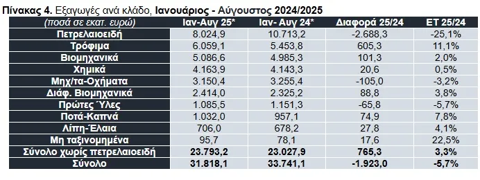 Αν εξαιρεθούν τα πετρελαιοειδή, οι εξαγωγές αγαθών κατά την περίοδο Ιανουαρίου–Αυγούστου 2025 ανήλθαν σε €24.463,8 εκατ., καταγράφοντας αύξηση κατά €822,1 εκατ. ή 3,5% σε σύγκριση με την αντίστοιχη περίοδο του 2024, όπου είχαν διαμορφωθεί σε €23.641,7 εκατ. Αντίστοιχα, οι εισαγωγές χωρίς πετρελαιοειδή αυξήθηκαν κατά €1.466,8 εκατ. ή 3,5%, φτάνοντας τα €43.206,3 εκατ. έναντι €41.739,5 εκατ. το 2024. Ως εκ τούτου, το έλλειμμα του εμπορικού ισοζυγίου χωρίς πετρελαιοειδή παρουσίασε επιδείνωση, καθώς διαμορφώθηκε σε €-18.742,5 εκατ., αυξημένο κατά €644,7 εκατ. ή 3,6% σε σχέση με το αντίστοιχο διάστημα του προηγούμενου έτους.