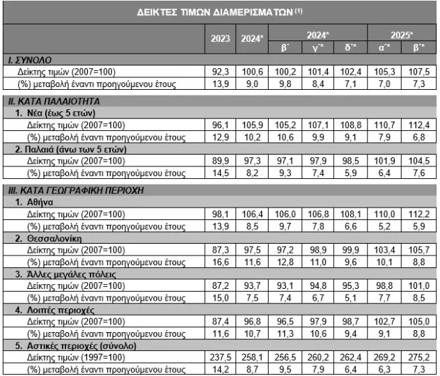 Τέλος, για το σύνολο των αστικών περιοχών της χώρας, το β΄ τρίμηνο του 2025 οι τιμές των διαμερισμάτων ήταν κατά μέσο όρο αυξημένες κατά 7,3% σε σύγκριση με το β΄ τρίμηνο του 2024, ενώ για το 2024 η μέση ετήσια αύξηση διαμορφώθηκε στο 8,7% (αναθεωρημένα στοιχεία).