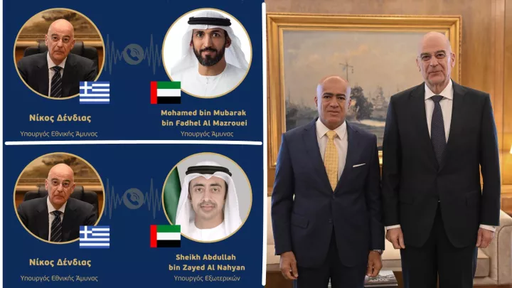 Ο υπουργός Εθνικής Άμυνας, Νίκος Δένδιας είχε τηλεφωνική επικοινωνία με τον υπουργό Άμυνας των Ηνωμένων Αραβικών Εμιράτων (ΗΑΕ) Mohamed bin Mubarak bin Fadhel Al Mazrouei και τον υπουργό Εξωτερικών Sheikh Abdullah bin Zayed Al Nahyan, ενώ συναντήθηκε στο υπουργείο Εθνικής Άμυνας με τον πρέσβη των ΗΑΕ, Dr. Ali Obaid Ali Alyabhouni Aldhaheri, στο πλαίσιο της Συμφωνίας για τη Συνεργασία των δύο χωρών στην Εξωτερική Πολιτική και 'Αμυνα.