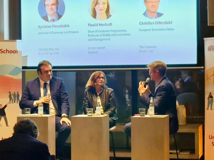 Τη συζήτηση άνοιξε η πρόεδρος του Hertie School Κορνήλια Γούλ με τον Κώστα Μπακογιάννη, πρώην Δήμαρχο Αθηναίων και fellow στο Hertie School να απευθύνει χαιρετισμό. Συνομιλητής του Υπουργού Εθνικής Οικονομίας και Οικονομικών Κυριάκου Πιερρακάκη ήταν η Θουρίντ Χούστετ, Κοσμήτορας Μεταπτυχιακών Προγραμμάτων και Καθηγήτρια Δημόσιας Διοίκησης και Management στο Hertie School. Τον συντονισμό ανέλαβε ο Κρίστιαν Όντενταλ, European Economics Editor του The Economist. Στην εκδήλωση παρέστη ως συνδιοργανωτής ο Συμεών Τσομώκος, Ιδρυτής και Επικεφαλής του Delphi Economic Forum.