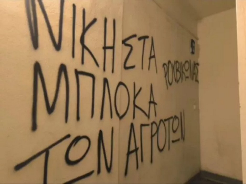 Τα γραφεία της Νέας Δημοκρατίας στη Λάρισα βανδάλισαν το βράδυ της Τετάρτης μέλη του Ρουβίκωνα. Οι δράστες πέταξαν τρικάκια και έγραψαν συνθήματα στους τοίχους, εκφράζοντας τη συμπαράστασή τους στις αγροτικές κινητοποιήσεις.