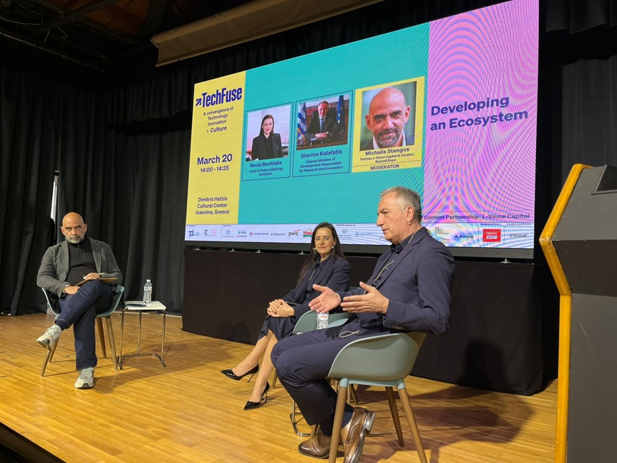 Στο πλαίσιο του συνεδρίου TechFuse και στη συζήτηση με θέμα την ανάπτυξη ενός οικοσυστήματος ο κ. Καλαφάτης αναφέρθηκε μεταξύ άλλων στον τρόπο που η Πολιτεία στηρίζει το ελληνικό οικοσύστημα καινοτομίας με ειδικά προγράμματα και φορολογικά κίνητρα, στο έργο και τα αποτελέσματα του Εθνικού Μητρώου Νεοφυών Επιχειρήσεων “Elevate Greece” και στη δημιουργία 13 κόμβων καινοτομίας στις Περιφέρειες της χώρας.
