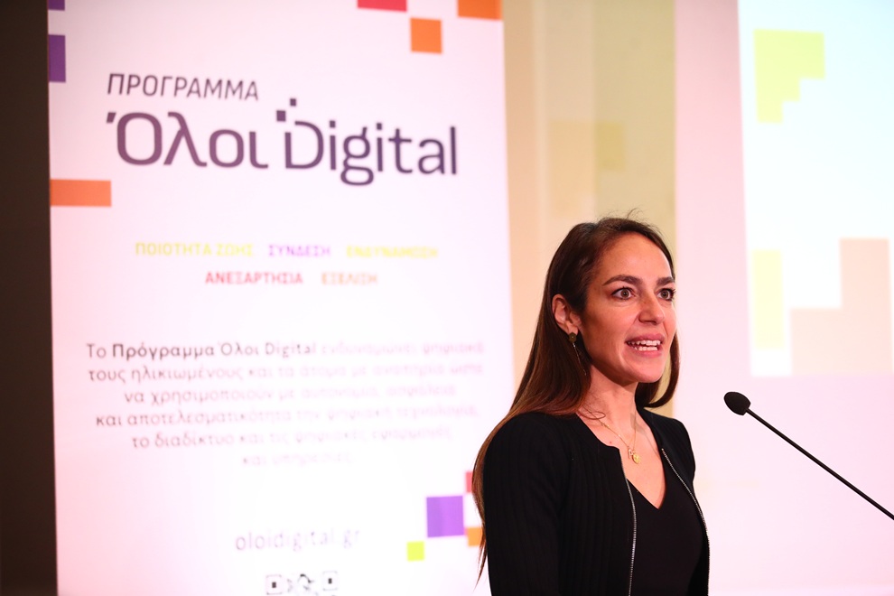 Μάλιστα, η ίδια πρόσθεσε ότι «η προσβασιμότητα ειδικά για τα ΑμεΑ, δεν είναι μόνο στον γεωγραφικό χώρο που μπορούμε να αγγίξουμε, είναι και στον ψηφιακό και η κοινωνικοποίηση των ΑμεΑ αλλά και των ατόμων τρίτης ηλικίας, των γιαγιάδων και των παππούδων. Πώς μπορούν να μιλήσουν με έναν φίλο τους σε άλλη πόλη, με τα παιδιά τους, να παραγγέλλουν από super market. Όλα αυτά διευκολύνονται μέσα από το πρόγραμμα Όλα Digital. Να είμαστε Όλοι Digital σε κάθε ηλικία».