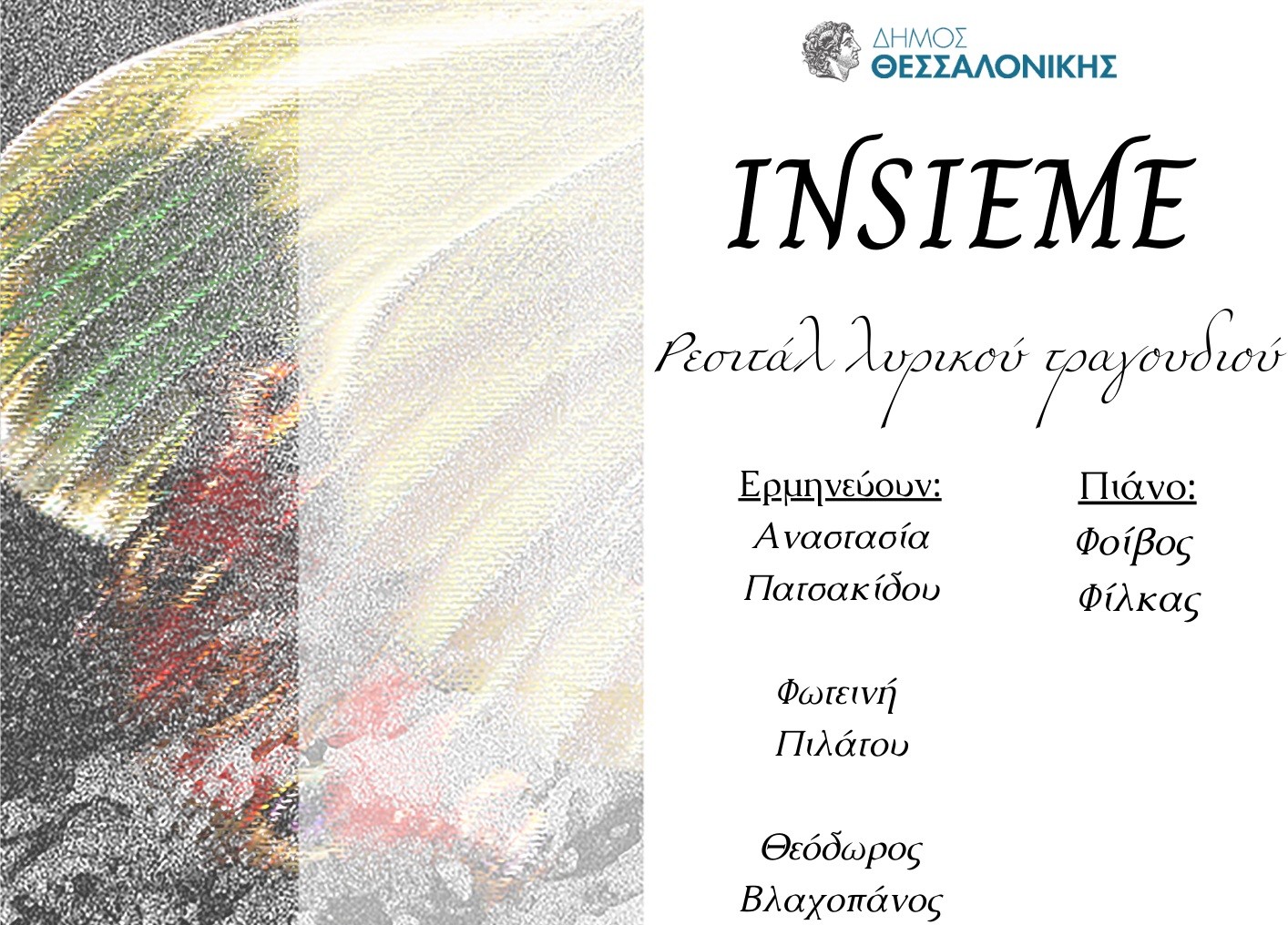 Ρεσιτάλ λυρικού τραγουδιού με τίτλο «INSIEME» διοργανώνει το Βαφοπούλειο Πνευματικό Κέντρο του Δήμου Θεσσαλονίκης, την Τετάρτη 11 Φεβρουαρίου 2026, με τους Αναστασία Πατσακίδου (σοπράνο), Φωτεινή Πιλάτου (σοπράνο), Θεόδωρο Βλαχοπάνο (βαρύτονος) και Φοίβο Φίλκα (πιάνο).