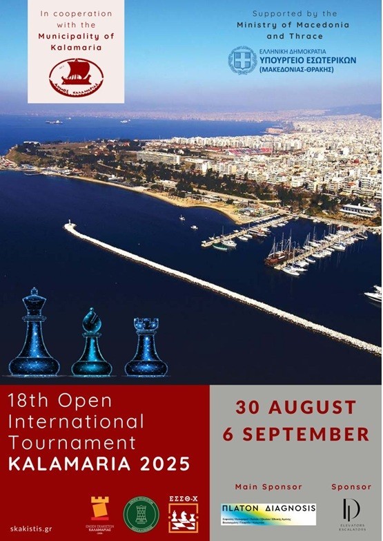Η Ένωση Σκακιστών Καλαμαριάς, σε συνεργασία με τον Δήμο Καλαμαριάς, την Ένωση Σκακιστών Θεσσαλονίκης, τη Σκακιστική Ακαδημία «Γιώργος Ιωακειμίδης» και με τη στήριξη της Ε.Σ.Σ.Θ.-Χ., διοργανώνει το 18ο Ανοιχτό Διεθνές Τουρνουά Σκάκι Καλαμαριάς, από τις 30 Αυγούστου έως τις 6 Σεπτεμβρίου 2025, στον φιλόξενο χώρο του Δημοτικού Θεάτρου Καλαμαριάς «Ναύαρχος Βότσης».