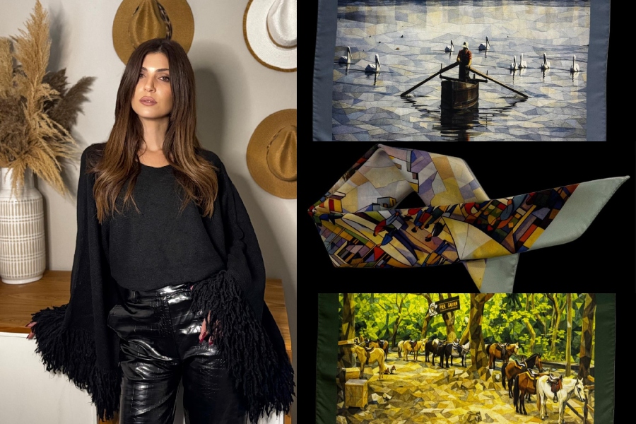 Η ανάγκη της να δημιουργήσει για τον τόπο της, της έδωσε την ιδέα να σχεδιάσει τα πιο σικάτα μεταξωτά μαντήλια που ενώνουν -όπως είπε- τη σύγχρονη μόδα με τις μνήμες.
