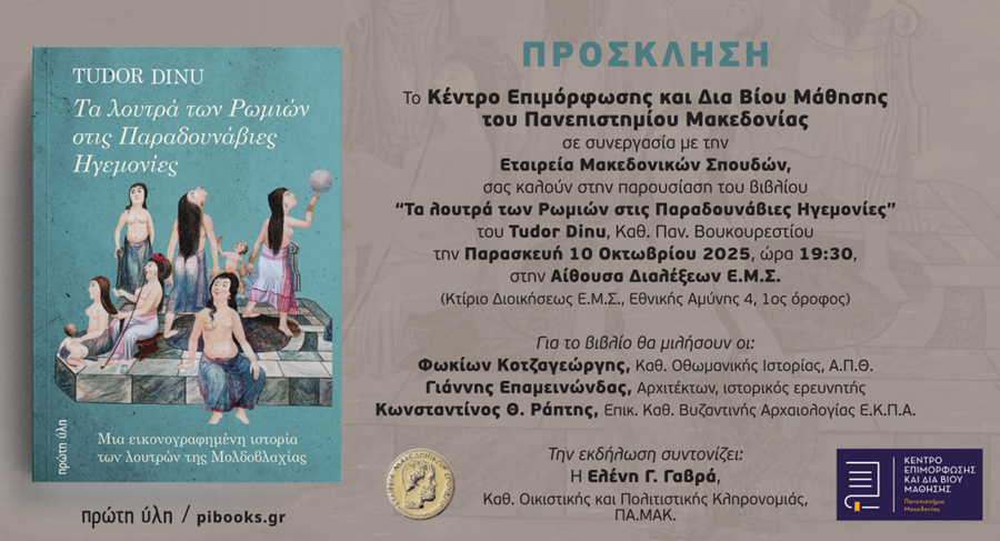 Το Κέντρο Επιμόρφωσης και Διά Βίου Μάθησης του Πανεπιστημίου Μακεδονίας, σε συνεργασία με την Εταιρεία Μακεδονικών Σπουδών, διοργανώνουν την παρουσίαση του βιβλίου «Τα λουτρά των Ρωμιών στις Παραδουνάβιες Ηγεμονίες», του καθηγητή του Πανεπιστημίου Βουκουρεστίου, Tudor Dinu.