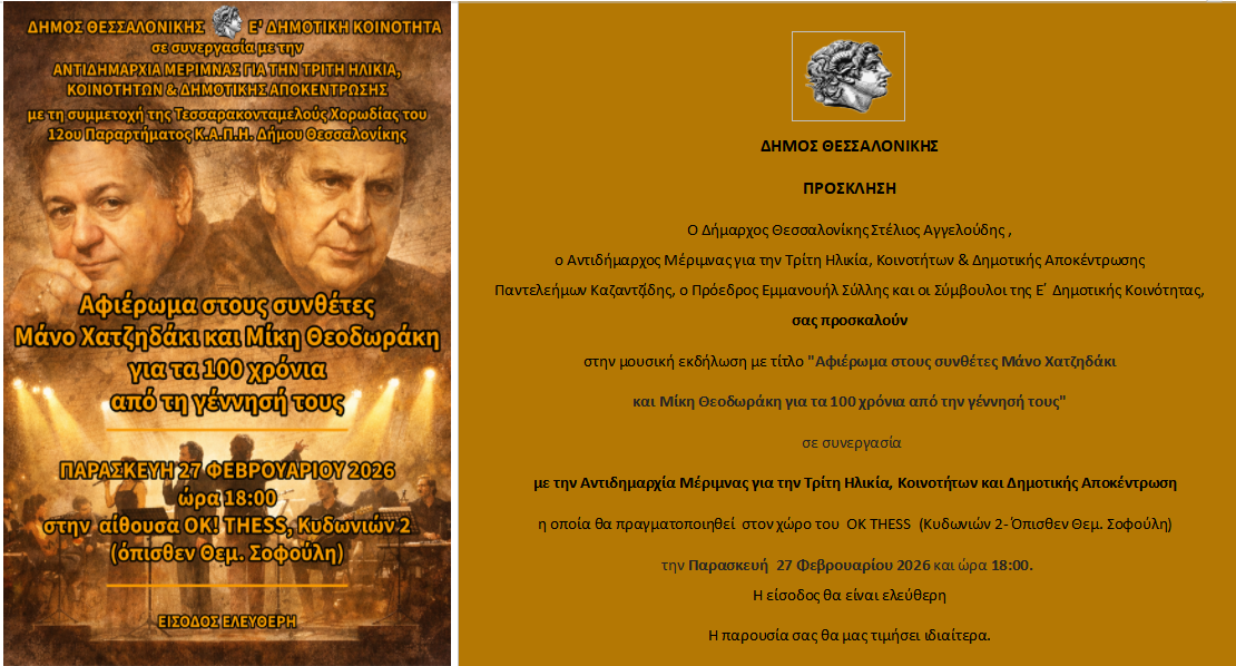 Η Ε΄ Δημοτική Κοινότητα του δήμου Θεσσαλονίκης σε συνεργασία με την αντιδημαρχία Μέριμνας για την Τρίτη Ηλικία, Κοινοτήτων και Δημοτικής Αποκέντρωσης, διοργανώνει μουσική εκδήλωση με τίτλο: «Αφιέρωμα στους συνθέτες Μάνο Χατζηδάκι και Μίκη Θεοδωράκη για τα 100 χρόνια από την γέννησή τους».