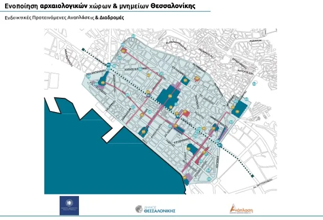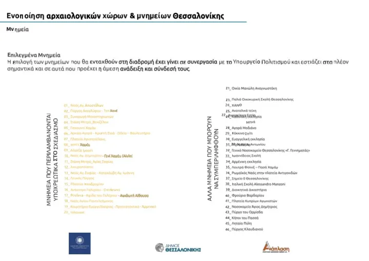 Η επιλογή των μνημείων έχει γίνει σε συνεργασία με το Υπουργείο Πολιτισμού και εστιάζει στα πλέον σημαντικά από αυτά, καθώς και σε εκείνα που προέχει η άμεση ανάδειξη και σύνδεσή τους. Όπως εξήγησε ο κ. Ακριτίδης, στον σχεδιασμό περιλαμβάνονται υποχρεωτικά 20 μνημεία ενώ αλλα 26 μπορούν να συμπεριληφθούν στις προτάσεις που θα κατατεθούν. Μεταξύ των μνημείων που θα ενταχθούν υποχρεωτικά στο πλάνο ενοποίησης είναι ο Λευκός Πύργος, η Ροτόντα, το Ανάκτορο του Γαλερίου, ο Ναός Αγ. Αποστόλων, ο Πύργος Αναγλύφου – Τοπ Χανέ, οι στάσεις του Μετρό «Βενιζέλου» και «Αγίας Σοφίας», η πλατεία Αριστοτέλους, η Παναγία Αχειροποίητος, η πλατεία Ιπποδρομίου, η Αρχαία Αγορά, το Αλατζά Ιμαρέτ, ο Ναός Αγίου Παντελεήμονος, το Ισλαχανέ και τα Κοιμητήρια Ευαγγελίστριας. Στη «δεξαμενή» των υπολοίπων 26 περιλαμβάνονται, μεταξύ άλλων, οι Κήποι του Πασά, Η Ληταία Πύλη, ο Πύργος Κλαυδιανού, το Φρούριο του Βαρδαρίου, η Αγορά Μοδιάνο, ο Ρωμαϊκός Ναός στην πλατεία Αντιγονιδών, τα ανατολικά τείχη, η ΧΑΝΘ, η Αγιορειτική Εστία, τα Λουτρά Φοίνιξη -Πασά Χαμάμ, αλλά και η οικία Μανώλη Αναγνωστάκη, καθώς και το σημείο Ο της Θεσσαλονίκης.