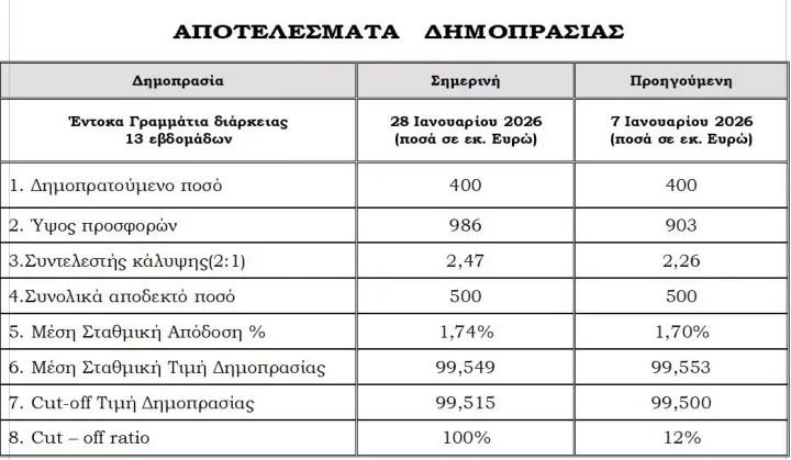 Η δημοπρασία πραγματοποιήθηκε μέσω των Βασικών Διαπραγματευτών Αγοράς (Primary Dealers), και η ημερομηνία διακανονισμού είναι η Παρασκευή 30 Ιανουαρίου 2026.