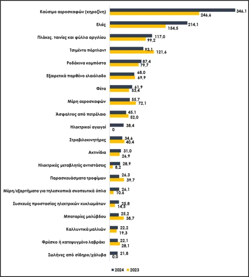 Αντίθετα, υποχώρηση και στις δύο περιόδους καταγράφουν τα παρασκευάσματα τροφίμων (HS 21069098 ) (-13,5% μεταξύ Απρ. - Σεπτ. 2025 και Απρ. - Σεπτ. 2024), τα μέρη αεροσκαφών (HS 88079090 )(-13,4%) και το τσιμέντο πόρτλαντ (HS 25232900) (-38,8%), ενώ οι ελιές παρουσιάζουν μικρή μείωση (-3,6% την περίοδο Απρ. - Σεπτ. 2025 έναντι της αντίστοιχης περιόδου του 2024).