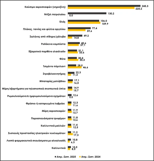 Την ίδια στιγμή, αρκετές κατηγορίες επέδειξαν ανθεκτικότητα και αύξηση και στις δύο περιόδους, όπως οι πλάκες, ταινίες και φύλλα αργιλίου (HS 7606 & 7607), οι οποίες αυξήθηκαν στα €77,4 εκατ. την περίοδο Απρ. - Σεπτ. 2025, σημειώνοντας άνοδο 29,8% σε σχέση με την αντίστοιχη περίοδο του 2024. Ανάλογη πορεία είχαν τα ροδάκινα κομπόστα (+9,4% την περίοδο Απρ. - Σεπτ. 2025 σε σχέση με την αντίστοιχη περίοδο του 2024), τα φαρμακευτικά σκευάσματα με αλκαλοειδή (HS 30049000) (+71,2%), οι στροβιλοκινητήρες (HS 84111230) (+97,4%) και το καύσιμο αεροσκαφών (HS 27101921) (+8,9%).