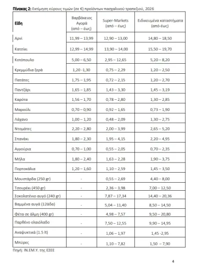 «Το Ινστιτούτο της ΕΣΕΕ αποτυπώνει και φέτος τις τιμές των προϊόντων του πασχαλινού τραπεζιού, εν μέσω έντονης διεθνούς αβεβαιότητας. Οι τιμές των τροφίμων για το πασχαλινό τραπέζι κινούνται για άλλη μία χρονιά ανοδικά, επιβαρύνοντας τα νοικοκυριά και τις περιορίζοντας τις δαπάνες για άλλα αγαθά. Η σημαντική αύξηση του φετινού πασχαλινού τραπεζιού οφείλεται: α) Στη διόγκωση του κόστους παραγωγής και μεταφοράς εξαιτίας της ανόδου των τιμών ενέργειας, β) στις ασθένειες που έπληξαν το ζωικό κεφάλαιο και γ) στο γεγονός ότι φέτος ορθόδοξο και καθολικό Πάσχα διαφέρουν μόνο κατά μία εβδομάδα, εξέλιξη που ενισχύει τη ζήτηση σε συγκεκριμένο χρονικό διάστημα. Οι τιμές στα σοκολατένια αυγά παρέμειναν στα ίδια περίπου με τα περυσινά επίπεδα, ενώ υπενθυμίζεται πως το 2025 είχε σημειωθεί ισχυρή αύξηση εξαιτίας της διόγκωσης της τιμής του κακάο. Σε κάθε περίπτωση, το μειωμένο διαθέσιμο εισόδημα κατευθύνεται περισσότερο στην κάλυψη των απαραίτητων αγαθών για το πασχαλινό τραπέζι μειώνοντας τις αυθόρμητες αγορές σε μία περίοδο που η παράταση των γεωπολιτικών εντάσεων προκαλεί προβληματισμό στην αγορά, αν και πέραν των τροφίμων και των καυσίμων δεν καταγράφονται, έως τώρα, ανατιμήσεις στα υπόλοιπα προϊόντα».