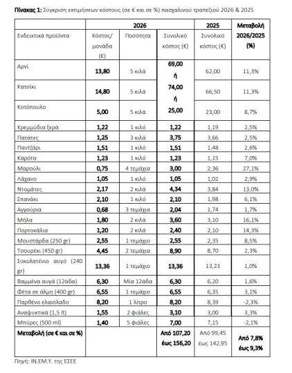 Η εκτίμηση του κόστους για το φετινό πασχαλινό τραπέζι (4-6 ατόμων) κυμαίνεται από 107,20 έως 156,20 ευρώ. Ως εκ τούτου, οι καταναλωτές θα αγοράσουν το ίδιο, σε σχέση με πέρυσι, καλάθι αγαθών, ακριβότερα κατά 7,8% έως 9,3%.
