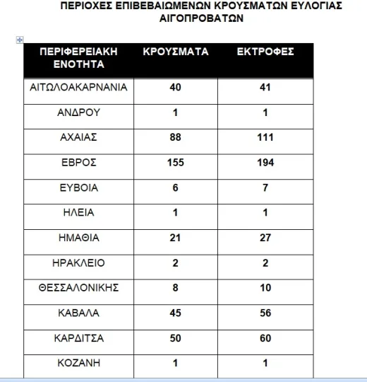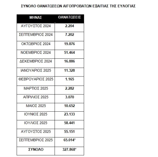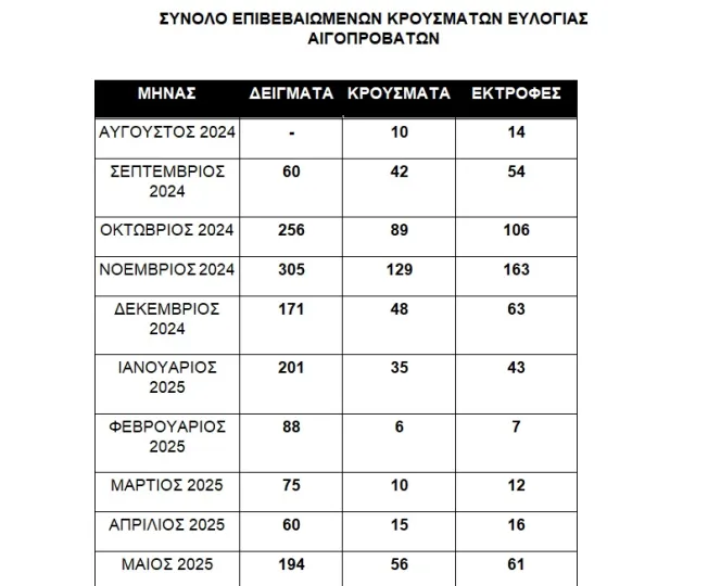 Σύμφωνα με στοιχεία του Υπουργείου Αγροτικής Ανάπτυξης και Τροφίμων (ΥπΑΑΤ), ο φετινός Σεπτέμβριος, είναι ο μήνας κατά τον οποίο κορυφώθηκαν οι θανατώσεις μολυσμένων ζώων με 65.014, έναντι 55.151 τον Αύγουστο και 58.441 τον Ιούλιο του τρέχοντος έτους και 7.202 τον περσινό (2024) Σεπτέμβριο. Σύμφωνα με τα ίδια στοιχεία, από τον Αύγουστο του 2024 έως και τις 30/09/2025 έχουν θανατωθεί συνολικά στη χώρα μας 327.868 αιγοπρόβατα, με τον αριθμό αυτόν να αναμένεται να αυξηθεί, καθώς υπάρχουν πολλά κρούσματα και μέσα στον Οκτώβριο, ενώ ο κατάλογος δεν περιλαμβάνει κρούσματα σε αιγοπρόβατα, που δεν έχουν θανατωθεί.