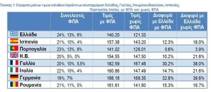 Η εικόνα των αποτελεσμάτων αλλάζει σημαντικά όταν αφαιρέσουμε τον αναλογούντα ΦΠΑ ανά χώρα για να γίνουν αντιληπτές οι πραγματικές τιμές των προϊόντων σουπερμάρκετ. Η σύγκριση των καλαθιών σε αυτή την περίπτωση (σχήμα 1 και πίνακας 1) δείχνει ότι οι και οι επτά χώρες έχουν πιο ακριβό μέσο καλάθι από την Ελλάδα, η Γερμανία κατά 39%, η Γαλλία κατά 38%, το Ηνωμένο Βασίλειο κατά 22%, η Ιταλία κατά 22%, η Ισπανία κατά 18% η Πορτογαλία κατά 4% και η Ρουμανία κατά 17%. Αυτό είναι αποτέλεσμα της διαφοράς που έχει ο χαμηλός ΦΠΑ ανά χώρα (πρόκειται για τον ΦΠΑ που αναφέρεται σε τρόφιμα και ποτά). Στην Ελλάδα αυτός ο ΦΠΑ είναι 13%. Ο ΦΠΑ είναι σημαντικά υψηλότερος από το Ηνωμένο Βασίλειο (0% ή 5%) και τη Γαλλία (10% και 5,5%), την Ισπανία (10% και 4%), την Πορτογαλία (13% και 6%), την Ιταλία (10% και 4%), την Γερμανία (7%) και την Ρουμανία (11% και 5%), αλλά και τις περισσότερες χώρες της ΕΕ. Η βασική διαφορά είναι ότι τρόφιμα που στην Ελλάδα υπάγονται ακόμα και στον μεσαίο συντελεστή ΦΠΑ με 13% στις υπόλοιπες χώρες υπάγονται στον χαμηλό συντελεστή ΦΠΑ, ο οποίος είναι και χαμηλότερος του ελληνικού με 6%, 5,5%, 4% ή ακόμα και 0%. Ελάχιστα προϊόντα βρίσκονται στον χαμηλό ΦΠΑ στην Ελλάδα και στον υψηλό στις άλλες χώρες (π.χ. μωρομάντηλα) Σημειώνεται ότι η επίδραση ειδικών φόρων κατανάλωσης (π.χ. καφές) δεν είναι δυνατόν να συνυπολογιστεί στα παραπάνω στοιχεία.
