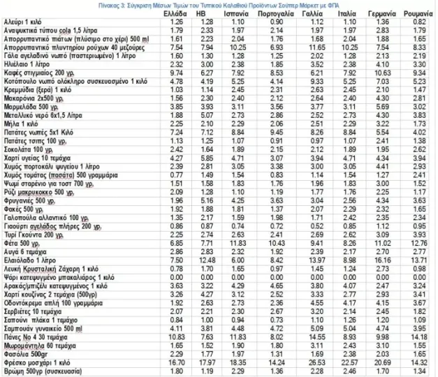 Η σύγκριση των μέσων τιμών των καλαθιών (πίνακας 1) δείχνει ότι και οι υπόλοιπες χώρες έχουν σημαντικά ακριβότερο μέσο καλάθι από την Ελλάδα, 33% η Γερμανία, 30% η Γαλλία, 10% το Ηνωμένο Βασίλειο, 15% η Ιταλία, 12% η Ισπανία, 15% η Ρουμανία και 1% η Πορτογαλία.