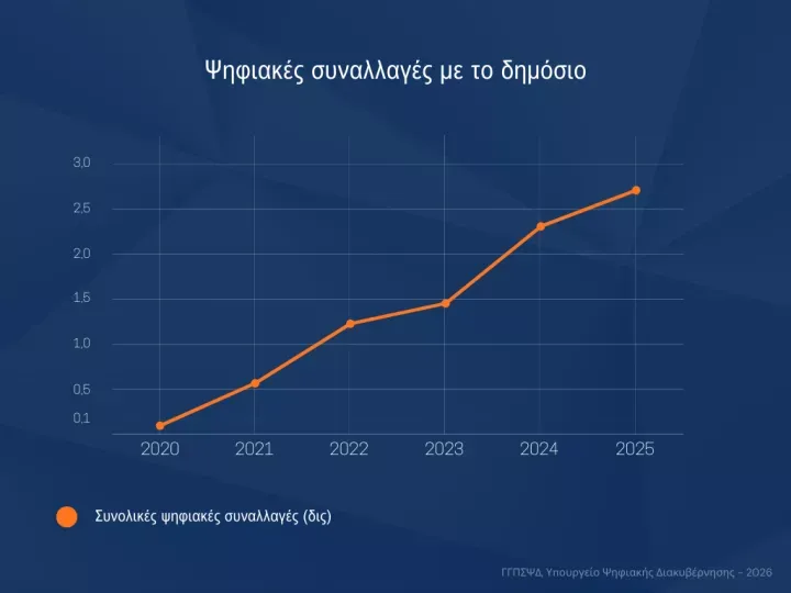 «Νέα μεγάλη αύξηση κατά 86% σε σχέση με το 2023 και κατά 17% σε σχέση με το 2024 κατέγραψαν οι ψηφιακές συναλλαγές των πολιτών με το Δημόσιο για το 2025, σύμφωνα και με τη στόχευση του Υπουργού Ψηφιακής Διακυβέρνησης και Τεχνητής Νοημοσύνης, Δημήτρη Παπαστεργίου.