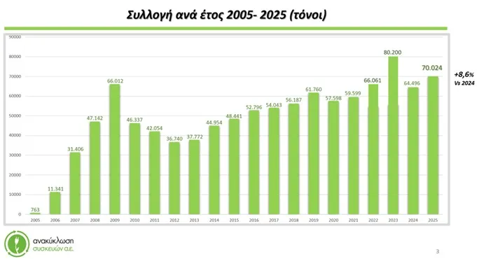 Το 2025 το σύστημα συνέλλεξε 70.024 τόνους ΑΗΗΕ με αυξητική τάση +8.6% έναντι του 2024.