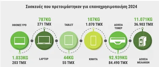 Ιδιαίτερο ενδιαφέρον παρουσιάζει η έννοια της «αστικής εξόρυξης», ειδικά στον τομέα των μικροσυσκευών και του εξοπλισμού πληροφορικής, όπου κρύβεται ένας ανεκμετάλλευτος θησαυρός πολύτιμων μετάλλων. Παρά το γεγονός ότι οι πλακέτες των κινητών και των υπολογιστών περιέχουν σπάνια μέταλλα όπως χρυσό και παλλάδιο, ένα μεγάλο μέρος τους παραμένει ανενεργό στα συρτάρια των καταναλωτών. Ωστόσο, η στροφή προς την επαναχρησιμοποίηση αποδίδει καρπούς, καθώς το 2024 (βλέπε πίνακα) περισσότερα από χίλια κινητά τηλέφωνα και εκατοντάδες laptops προετοιμάστηκαν για μια δεύτερη ζωή, ενώ πάνω από 121.000 δοχεία τόνερ και μελανιών βρήκαν ξανά τον δρόμο προς την αγορά. Αυτή η προσέγγιση μειώνει δραστικά την ανάγκη για νέες εξορύξεις και περιορίζει τις εκπομπές διοξειδίου του άνθρακα, ενισχύοντας τη βιωσιμότητα του οικονομικού μοντέλου.