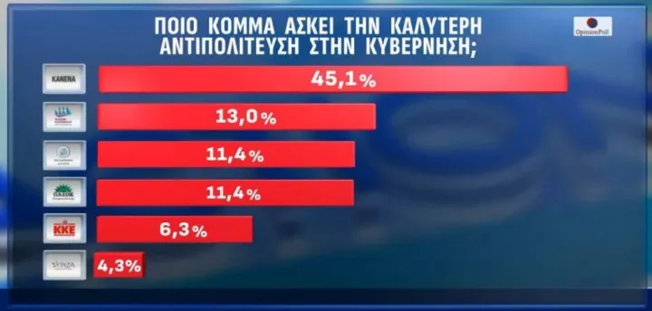 Το 45,15% απαντά «Κανένα» στην ερώτηση ποιο κόμμα θεωρεί ότι ασκεί την καλύτερη, πιο αποτελεσματική αντιπολίτευση. Από εκεί και πέρα πρώτη εμφανίζεται η Πλεύση Ελευθερίας με 13% και ακολουθούν Ελληνική Λύση και ΠΑΣΟΚ με 11,4%, ΚΚΕ 6,3%, ΣΥΡΙΖΑ 4,3%.