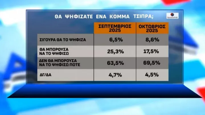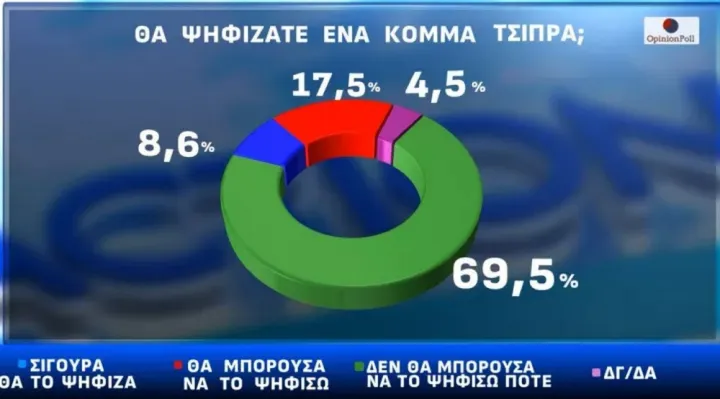 Στο ερώτημα αν θα ψήφιζαν ένα κόμμα Τσίπρα, σίγουρα απαντά το 8,6%, θα μπορούσα να το ψηφίσω το 17,5% και δεν θα μπορούσε να το ψηφίσει κανείς το 69,5%.